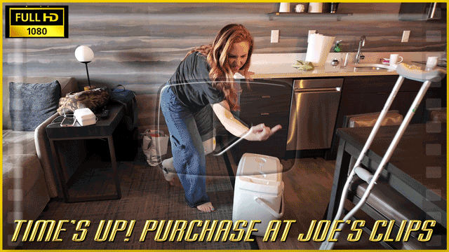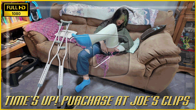 Ellen has discovered that she loves her cast and loves being casted. As her cast ages, she finds that she loves the smell of her blue SLC and casted toes. She starts off in bed in this clip, smelling her casted toes and not being able to resist rubbing one out before getting up. She crawls out of bed and scoots down the stairs. In the kitchen, she crutches around, getting herself a snack, when she hits her cast with the refrigerator door. This gives her the idea to be a little bit more rough on her cast, in hopes of getting to keep it longer. Cut to weeks later and her cast is noticeably older and dirty. She sits down and calls a friend, telling her about her cast and how she doesn't want to lose it yet. Once she's off the phone, she starts sniffing, licking and sucking her toes again as she masturbates with a vibrator. Finally, she tries jumping off the couch in an attempt to keep her cast longer.