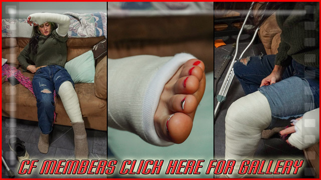 This gallery is part posing on crutches and part posing on the couch with some dirty socks over her toes. Don't worry, the socks come off for exposed toes in the next gallery.